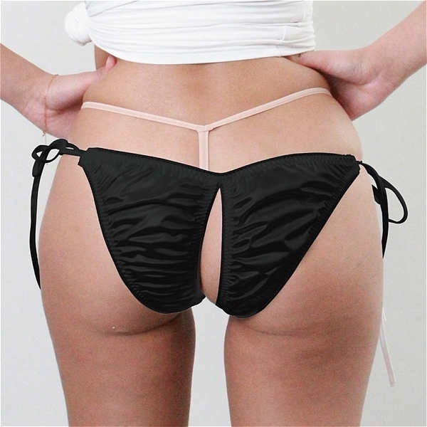 HOME > オープン ブラ・ショーツ(穴あき) > 光沢が有り肌触りの良い生地にレース付き脇ヒモ股ワレFB Lサイズ ブラック