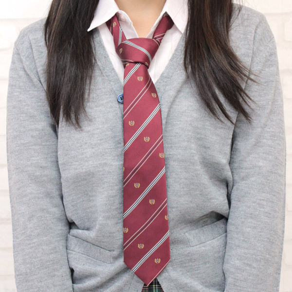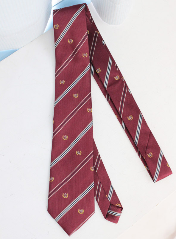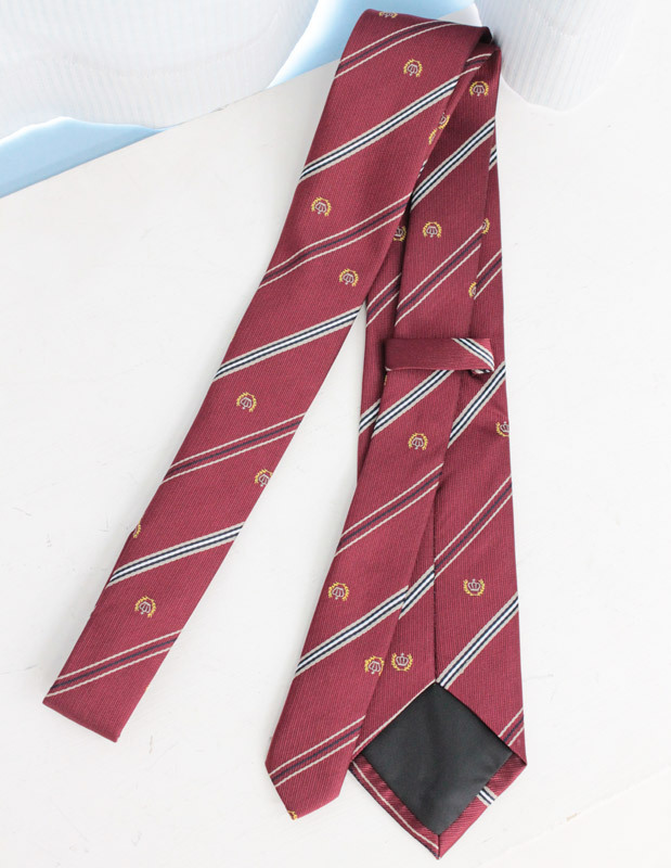 月桂樹に王冠の紋章が刺繍された、お嬢様風のスクールネクタイ(エンジ)。