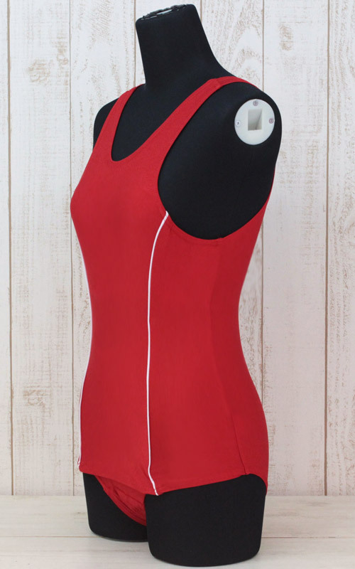 腰に水抜きのついた定番の旧スクも、赤色だと新鮮!サイドに縦ラインを入れたこだわりデザインのスクール水着コスチュームです。