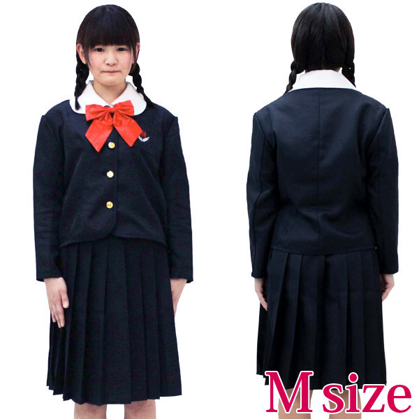 Mサイズ:B〜95cm・W〜72cm ブラウス:着丈56cm・袖丈18cm・肩幅40cm・首周り40cm ジャケット:着丈51cm・袖丈49cm・肩幅42cm スカート:丈57cm・吊り紐87cm セット内容:ブラウス・ジャケット(前ボタン留、胸ポケット有)、スカート(サイドファスナー、3段ホック留め、ウェスト一部ゴム入)、リボン(アジャスター調整可)