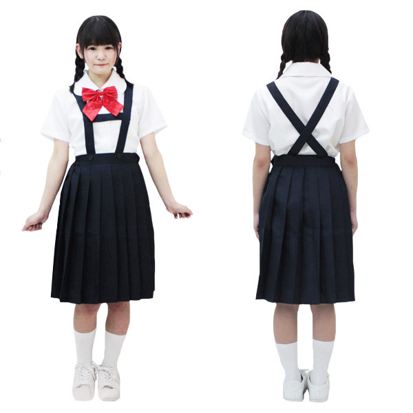 ●可愛い丸襟タイプの半袖ブラウス●アジャスター調節可能な赤リボン●金ボタン留め&刺繍入り胸ポケット付きのブレザー●H型フロント・X型バックのストラップ付き吊りスカート●膝にかかる程度の長めなお嬢様丈。