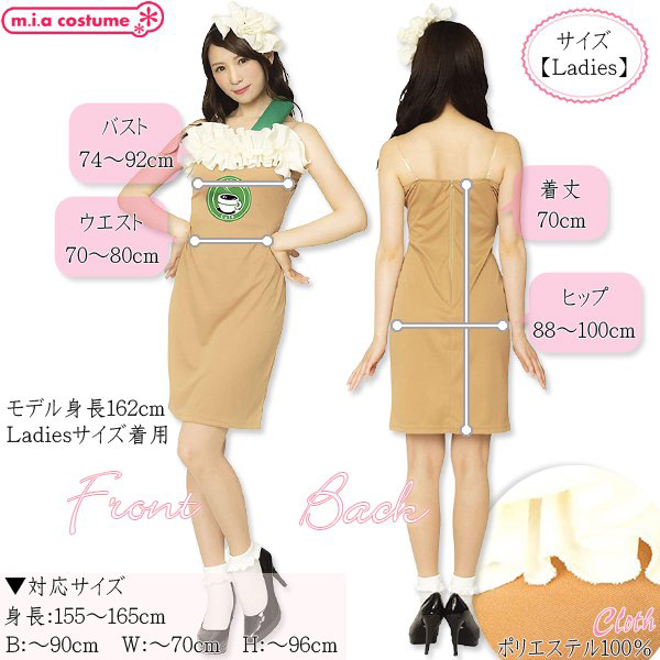 対応サイズ:身長155〜165cm・B〜90cm・W〜70cm・H〜96cm 実寸:B74〜92cm・W70〜80cm・H88〜100cm・着丈70cm(背中心) セット内容:カチューシャ、ワンピース(背中心ファスナー)、透明ストラップ、シール 素材:ポリエステル100% モデル身長162cm