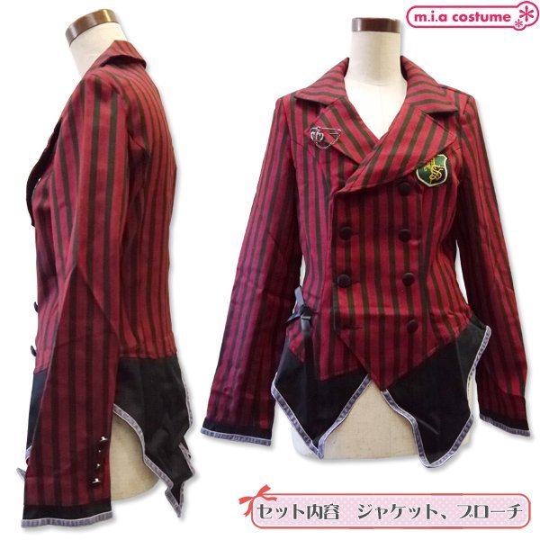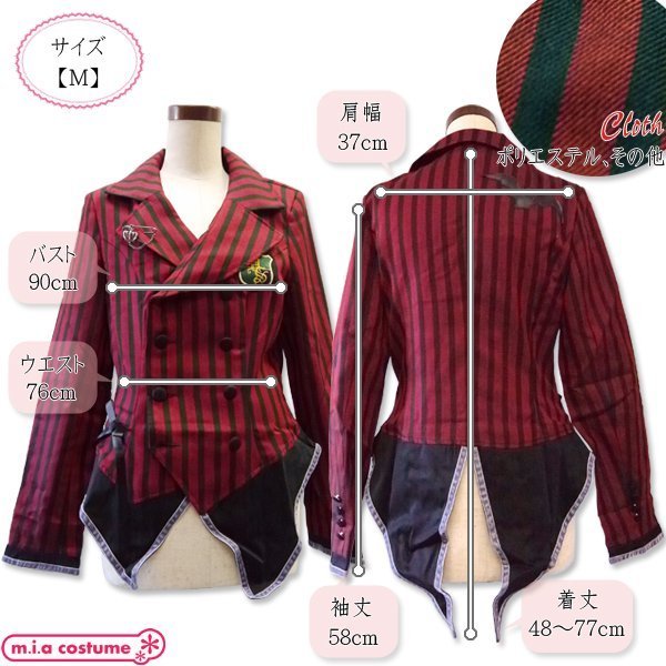ワッペン付きで前ボタンのジャケットにブローチが付属!男性の夜間の礼服である燕尾服の様な裾がポイントの「マッケンジー ワッペン付きストライプジャケット」です♪舞台用のステージ衣装やV系・ヴィジュアル系の衣装としても、プレゼント用にも良さげ!アンティークなダブルボタンのストライプ柄ジャケットだから、おしゃれに着こなせてパンツはもちろん、パニエを履いて可愛く着こなしても◎仮装イベントや学園祭にもおすすめです。
