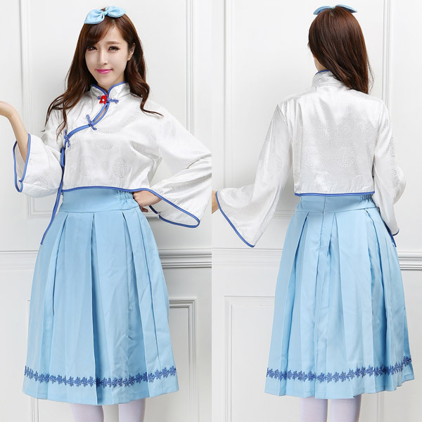 ハロウィンやコスプレイベントには白×青の清楚系な中華風ロリータで!歌うバーチャルアイドルの衣装をモチーフにしたコスチューム♪チャイナ服を彷彿とさせるデザインとツヤっとした白い生地のトップスに、サックスブルーのスカートとリボンがセットになった衣装。