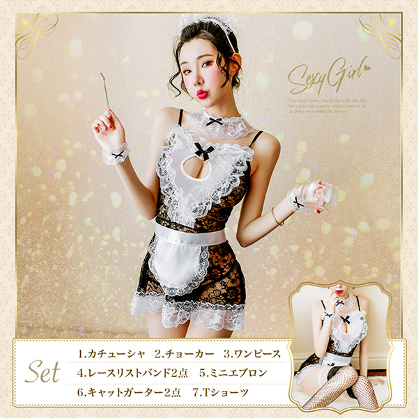 HOME > メイド服 > コスプレ レース ミニメイド 7点セット ブラック×ホワイト